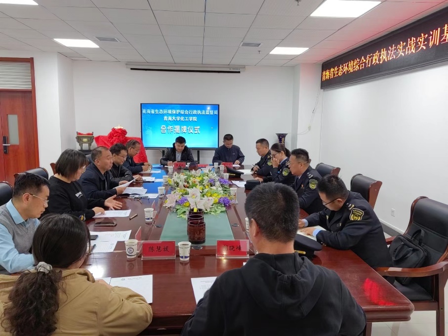 杨汉宁书记对省生态环境保护综合行政执法监督局一行的到来表示热烈的欢迎,并介绍了雷速体育 的基本情况,他指出,政校合作是一次相互学习、相互促进的机会,要发挥好双方各自优势,不断拓展合作内容。余全盛局长介绍了省生态环境保护综合行政执法监督局基本情况,并提出了合作意向,希望通过多种形式开展全面合作,实现资源共享、优势互补、协同创新,推进雷速体育 环境工程特色学科建设和全省生态环境执法监管能力提升的深度融合。随后,双方就学生实习、人员交流及培训和成果示范基地建设等方面进行了充分交流。常务副院长王晓与局长余全盛代表双方签署了《青海省生态环境综合行政执法实战实训基地框架协议》,院长刘大欢与局长余全盛共同为基地进行了揭牌。