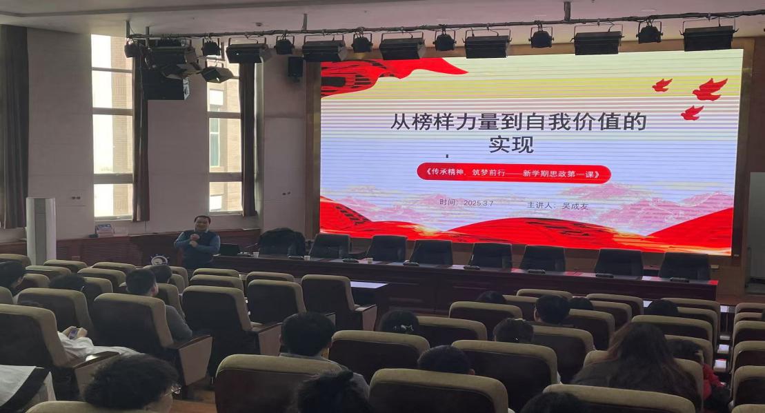 吴成友副院长从榜样力量到自我价值的实现、求真务实,杜绝学术不端、勤学苦练,提高科研素质等方面进行讲授,激励同学们以饱满的热情迎接新学期的挑战,要求同学们进一步加强政治理论学习,涵养家国情怀,提升人格修养,践行社会主义核心价值观,勤学苦练本领,建功新时代。