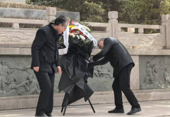 敬仰先烈,庄严肃穆祭英魂。祭扫仪式在庄严的国歌声中拉开帷幕,全体人员整齐列队,面向烈士墓碑肃立,神情庄重。李长顺与严刚2位同志缓步走向烈士墓碑,敬献花篮。花篮上的缎带随风飘动,上面书写着“烈士永垂不朽”的字样。全体人员默哀,并依次向烈士墓碑鞠躬、瞻仰,以表达对烈士们的哀思与敬意。